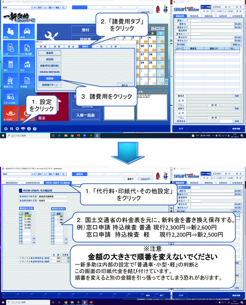 (例)変更前:1800円 → 変更後:2100円 ⇒ 印紙代が1800円で登録されている車両は、すべて2100円へ変更されます。